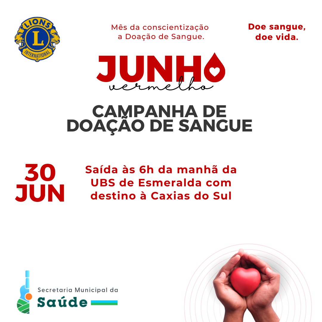 A Secretaria Municipal da Saúde em parceria com o Lions Clube de Esmeralda/RS, convida você a participar de um gesto de amor e solidariedade: o grupo de doação de sangue em comemoração ao Junho Vermelho!