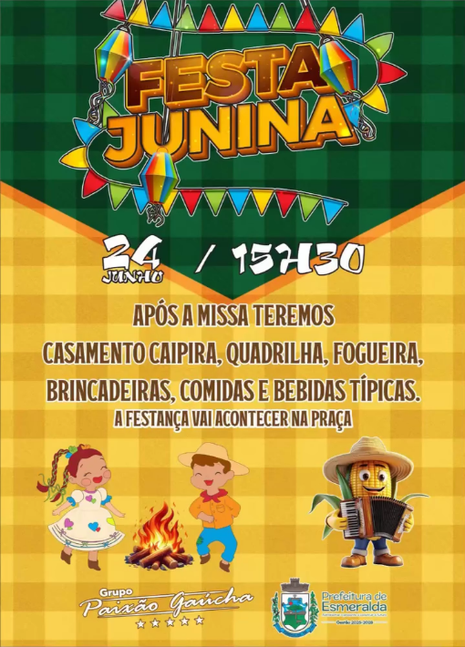 Dia 24 de junho Local: Praça Doutor Orly Labarthe Alves 15h30 – Missa Logo após: Casamento Caipira Quadrilha Fogueira Comidas e bebidas típicas Brincadeiras juninas. E muita animação com o Grupo Paixão Gaúcha. Realização: Prefeitura Municipal de Esmeralda