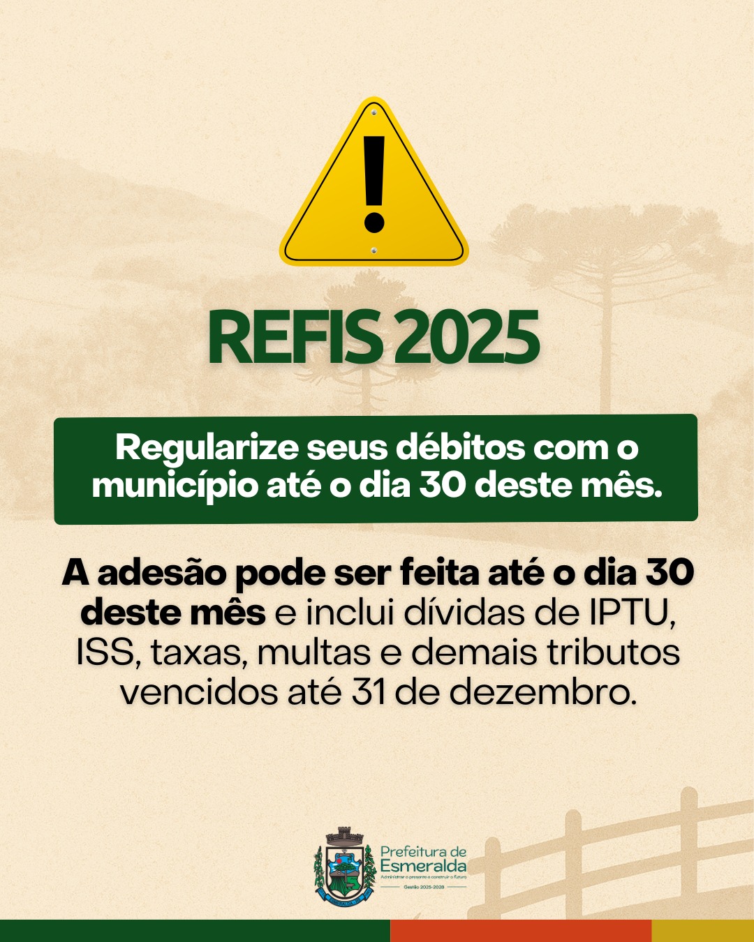 A Prefeitura Municipal de Esmeralda informa que segue disponível o Programa de Recuperação Fiscal (REFIS) para contribuintes que possuem débitos com o município.